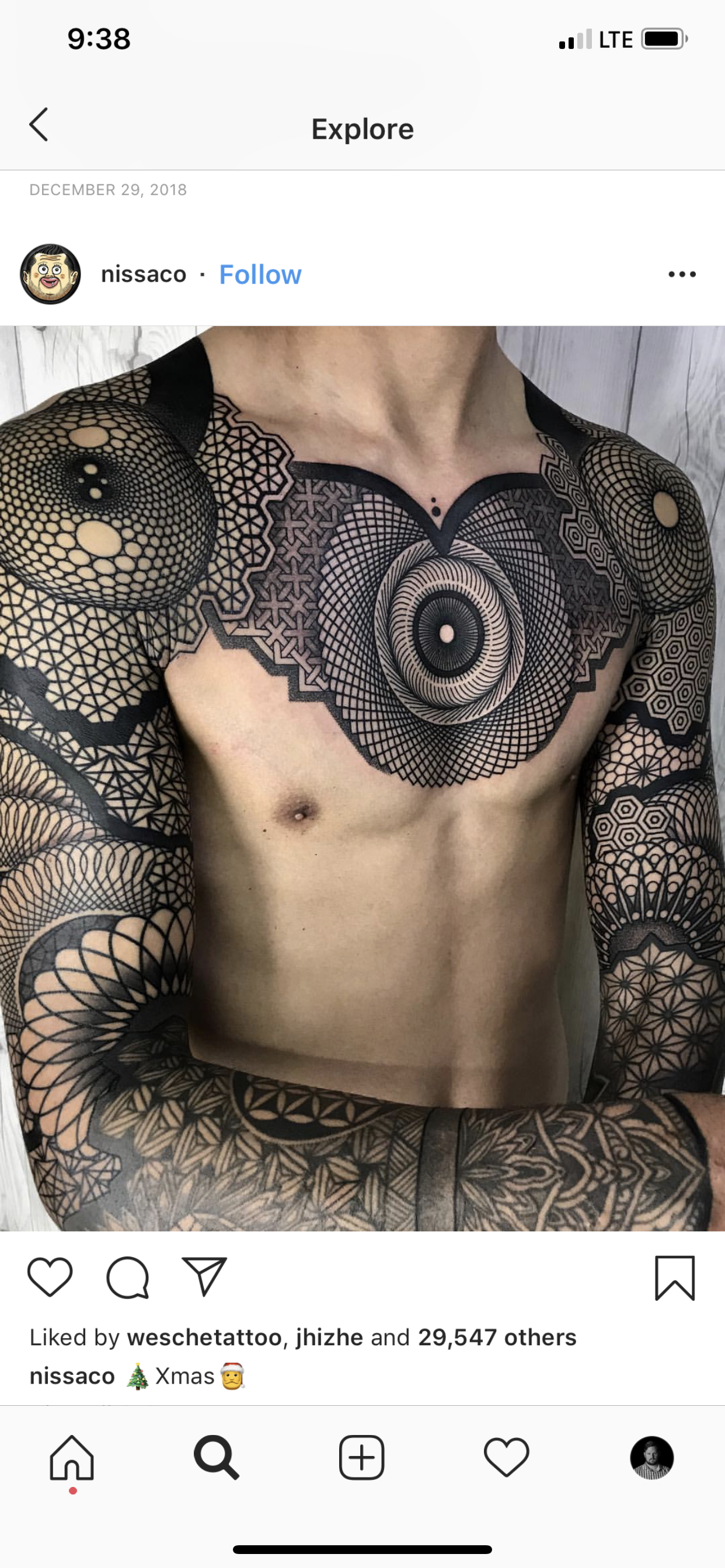While I am starting with the left side of my body, I’d like the option to do a similar thing on the right side. So the design over the chest should allow for that. Ideally more geometric work, but with inspiration from other travels, etc. Below is an example of the sort of shape I am thinking about.